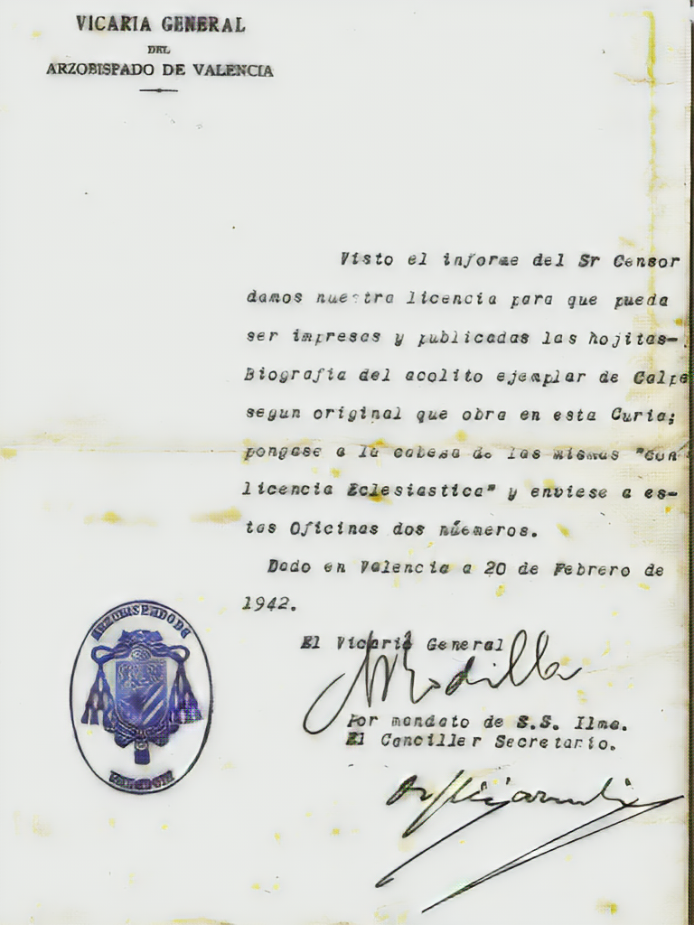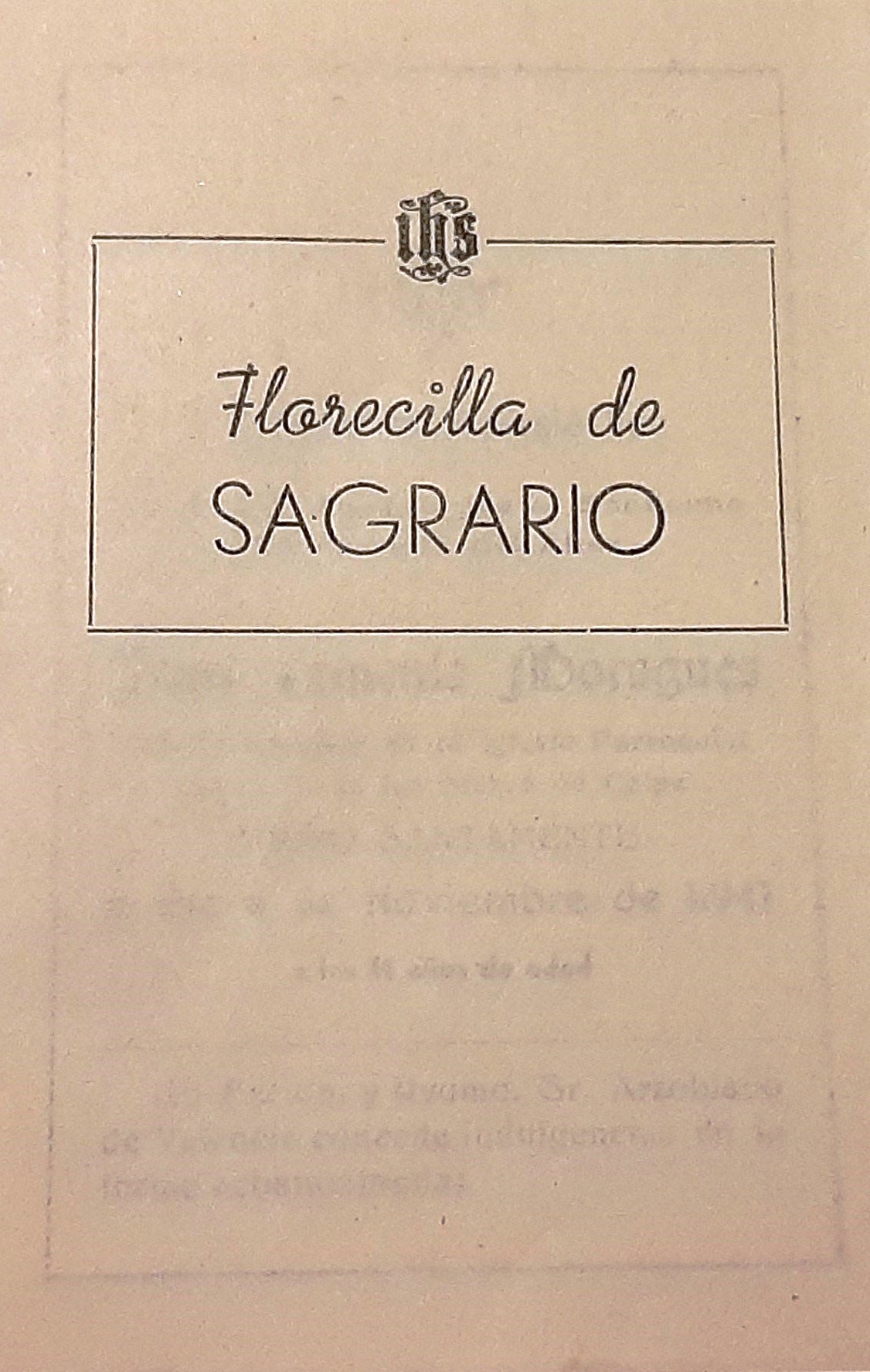 Después de su muerte, el cura Llopis pidió permiso al Arzobispado de Valencia para publicar un pequeño librito con el título Florecilla del Sagrario. Este fue autorizado por la Vicaria General del Arzobispado en fecha 20 de Febrero de 1942. Entresacamos varios párrafos de este librito: días antes de su primera comunión escribió varias cartas al Niño Jesús del Sagrario que con sencillez encantadora depositaba junto a la misma puerta del Sagrario o entre los corporales.