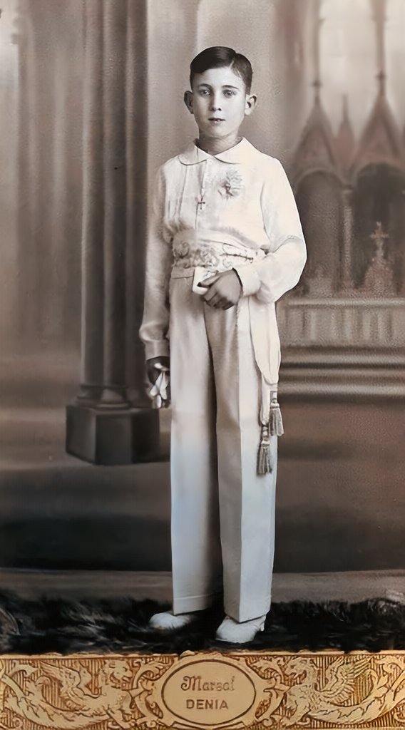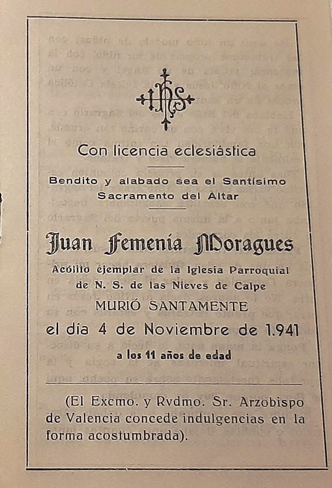 Hoy queremos rescatar del olvido la vida de uno de estos jóvenes: Juan Femenía Moragues que con seis años ya estaba volcado en la vida de nuestra parroquia. Juan era servicial, responsable, cantaba y dibujaba muy bien. Tras la muerte del cura Francisco Sendra en Septiembre de 1936, en muchas ocasiones suplía al sacristán en los cantos en la misa y en los entierros, colocaba los ornamentos y ponía las formas en el copón. Durante los años 1936/39 la iglesia fue cerrada al culto y convertida en mercado de abastos, por esa razón, las misas se celebraban, en su gran mayoría, en la plaza de la villa por parte del capellán castrense el alférez Manuel Hurtado.