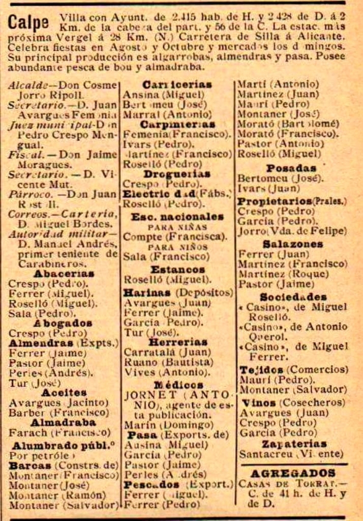 En el año 1913 existían en Calp tres carnecerías: Miguel Ausina Oliver “Mola”, José Bertomeu Avargues “Benitet” y Antonio Marral. Las dos primeras; la de Mola en la calle Mayor y la de Benitet en la calle del Calvario. En el catastro de 1893 aparece José Marral propietario de una casa en la calle Mayor; José es vecino de Gandía. Podría ser familiar de Antonio Marral.