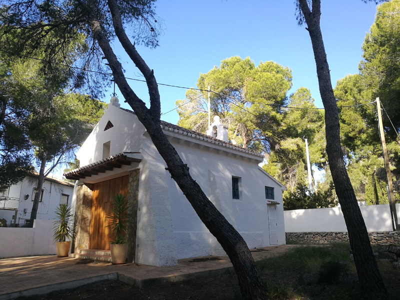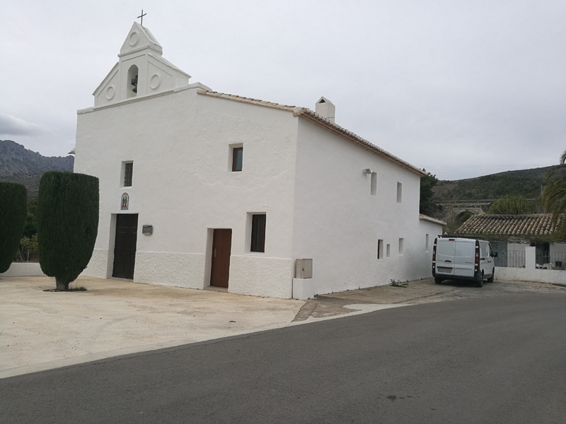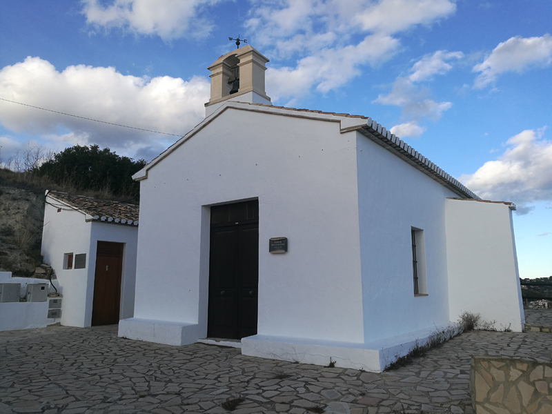 Se inicia el culto en la ermita en los primeros años de siglo XVIII con licencia del vicario general Martí López de Vergara y se completa la obra con la bendición de la campana en 1712. En el mismo edificio está la iglesia y la casa ocasional del párroco bien diferenciadas ambas estancias a vista de pájaro por la distinta configuración de las cubiertas; la ermita es a dos aguas y la casa se cubre a una sola vertiente. En la fachada principal, la separación también la marca la altura: la ermita sería un rectángulo cerrado en lo alto por una leve imposta de donde parte una espadaña o frontón doblemente triangulado con el hueco para la campana y el vértice superior rematado con una cruz.