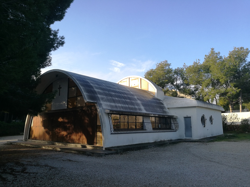La fachada principal, dividida en dos por una jácena horizontal, es toda de material removible; una gran puerta rectangular de madera que puede abrirse para que los fieles sigan el culto desde la explanada; sobre ella un panel blanco rectangular con una cruz latina de madera: los lados del panel hasta la curva de la cubierta se cierran con paneles traslúcidos rectangulares de distintos colores. Los laterales están recorridos por grandes ventanales a media altura que proporcionan mucha claridad al interior.