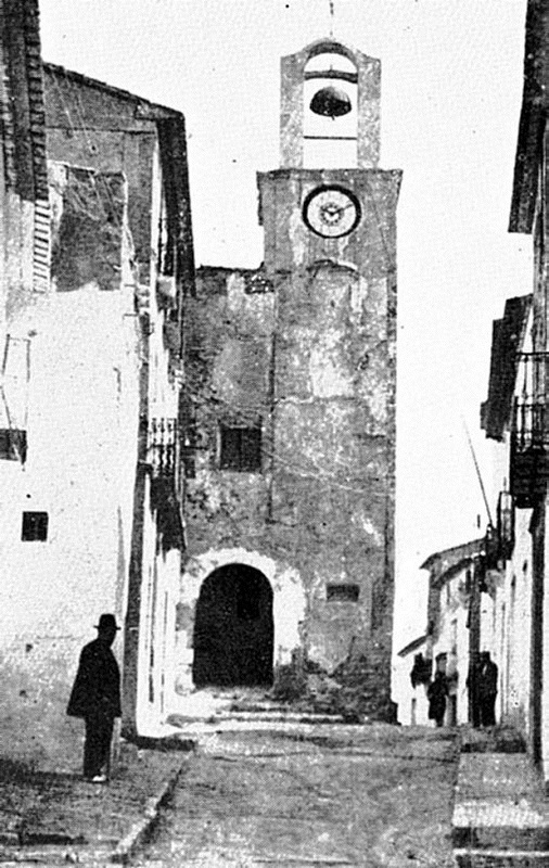 Nos metemos donde dice un lápida: “Plaza de la Constitución”, en cuya área difícilmente cogemos nosotros tres y el mulo. No exagero; calles y casas más comprimidas que aquí no las he visto en parte alguna. En dicha plaza ¡ transijamos con la hipérbole! Examino la puerta, con torre, del Albacar ó recinto interior amurallado, recorro éste, luego los restos de la muralla exterior, anoto las medidas, tomo gráficos de todo y nos personamos en la abadía.